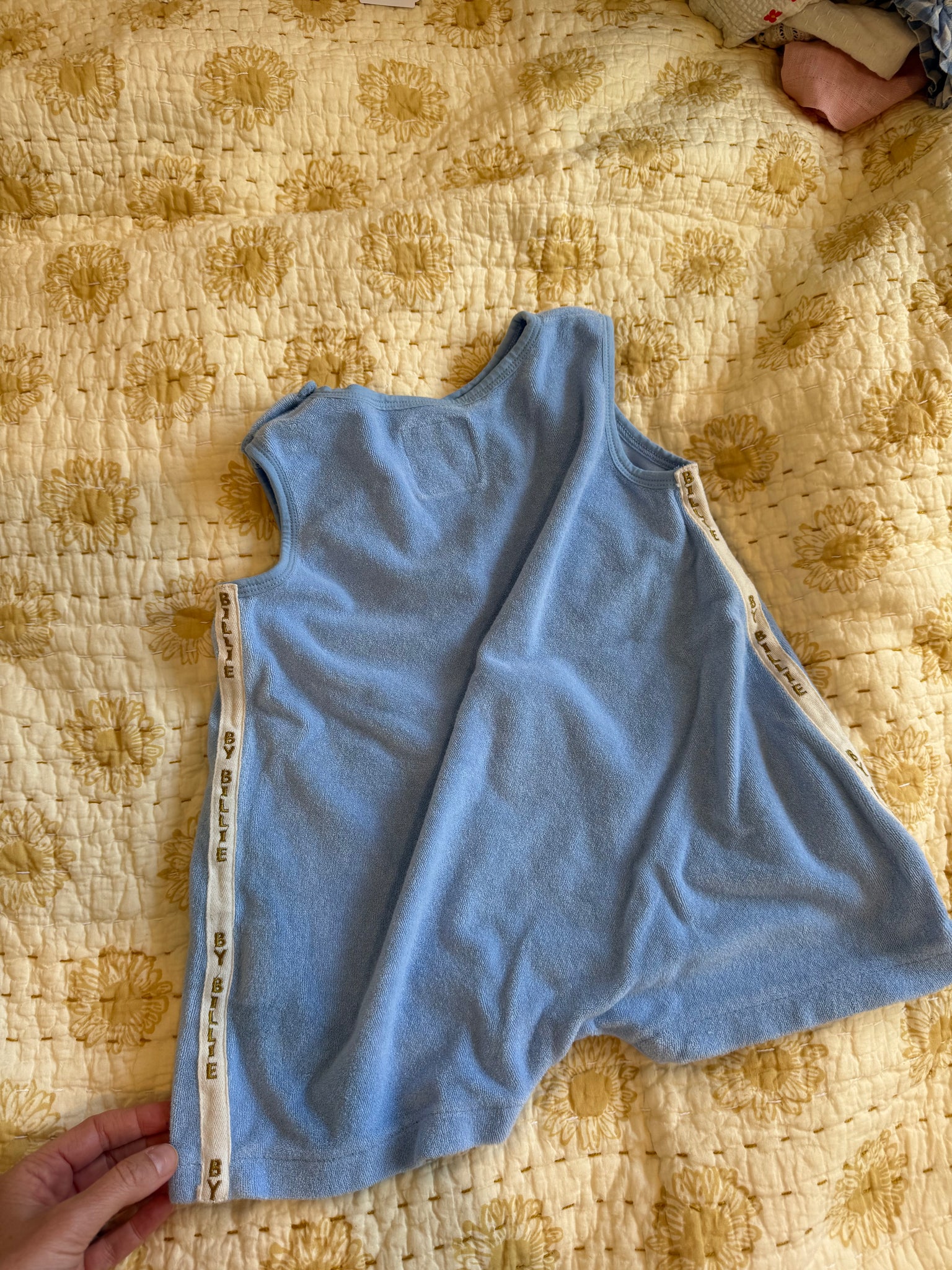 boys or hals, baby blue terry jumpsuit with stitching ribbon down the side, I LOVED these so much. Worn but washed no flaws , snap at bottom says size 3 but more like a 2-3